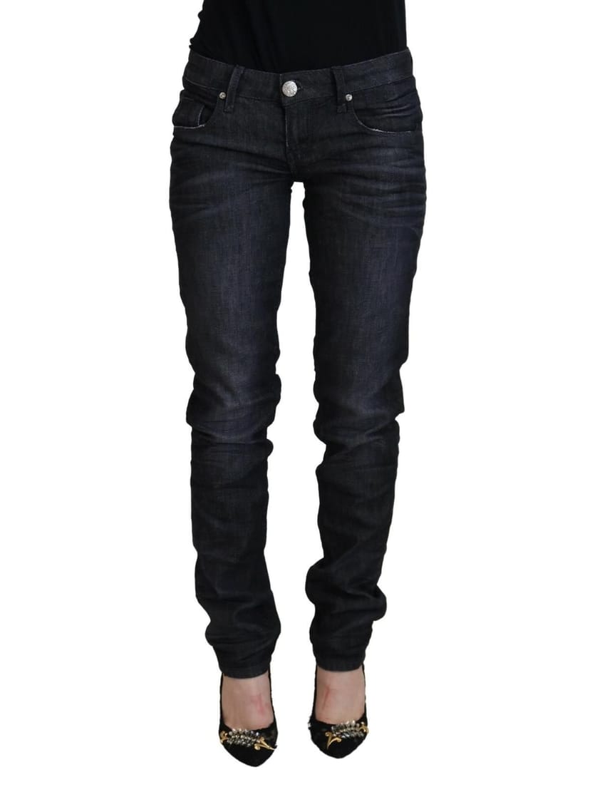 Stylish black low waist slim fit casual denim jeans by ACHT. Made from a comfortable blend of 98% cotton and 2% elastane, these jeans feature a zipper closure and logo details. Perfect for those who appreciate high-quality fashion.