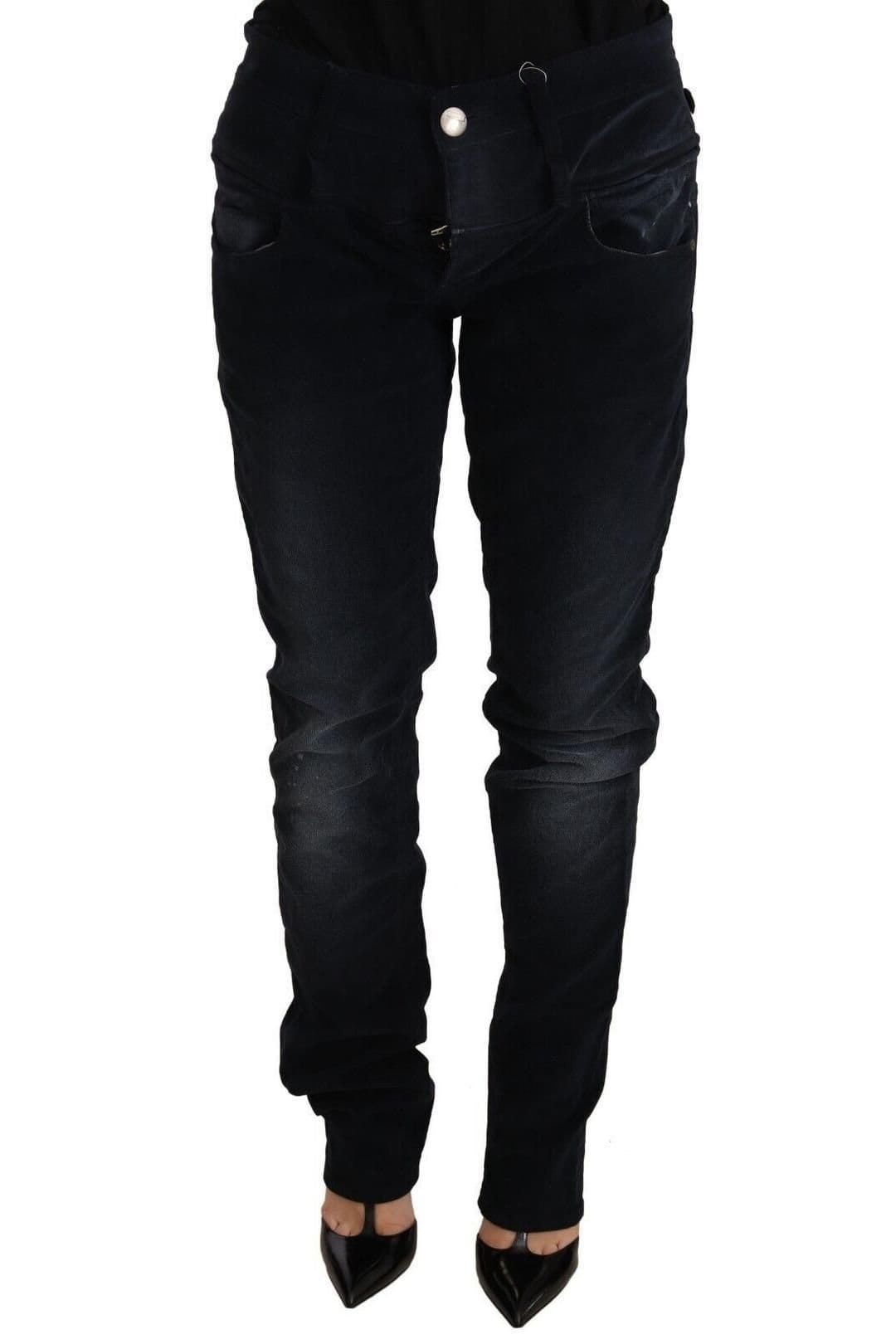 These blue washed cotton denim jeans by ACHT feature a slim fit and a zipper and button closure. The dark blue wash adds a stylish touch, making them perfect for a casual yet fashionable look.