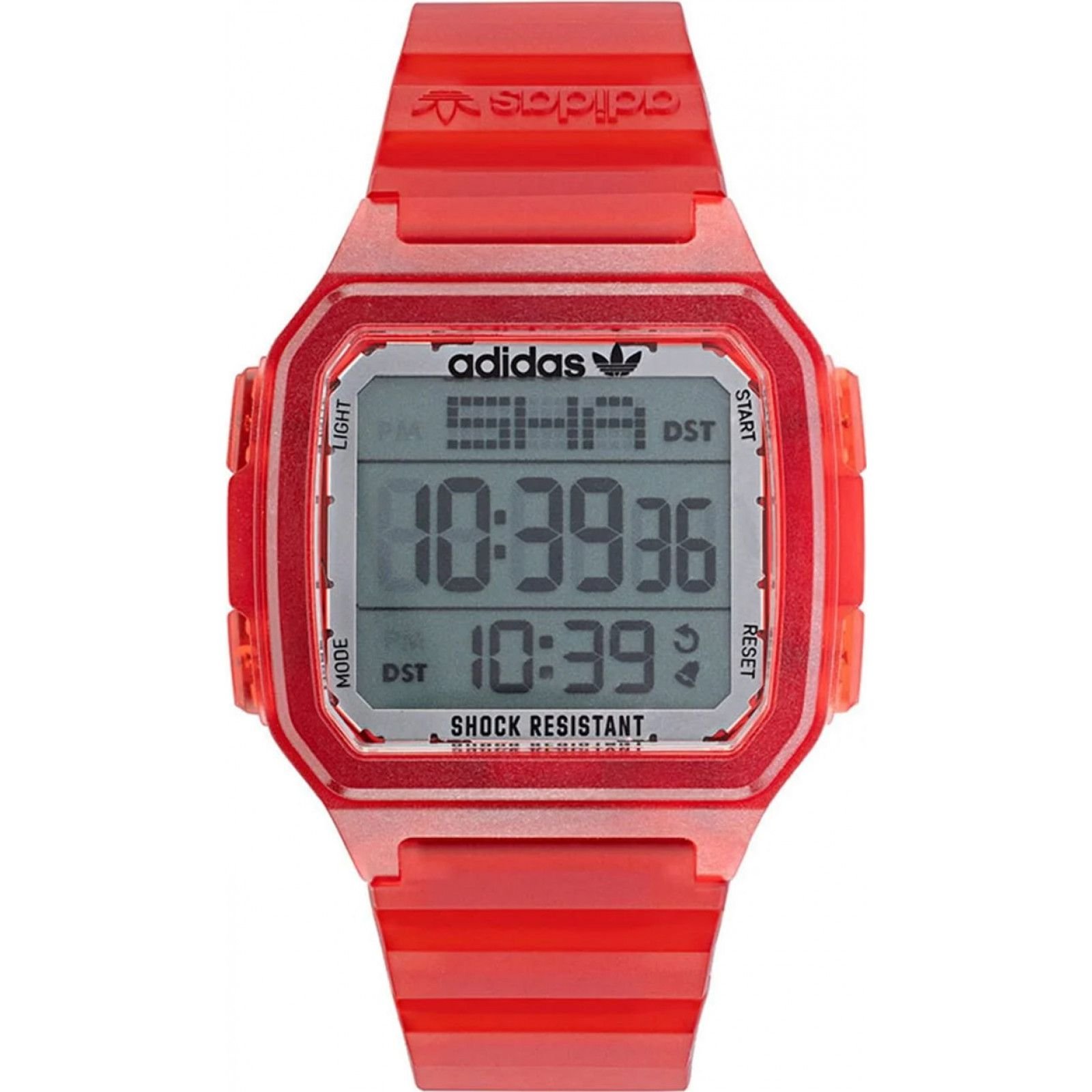 This adidas Originals watch features a red resin strap and a digital display with shock resistance. Ideal for everyday wear, it combines style and functionality.