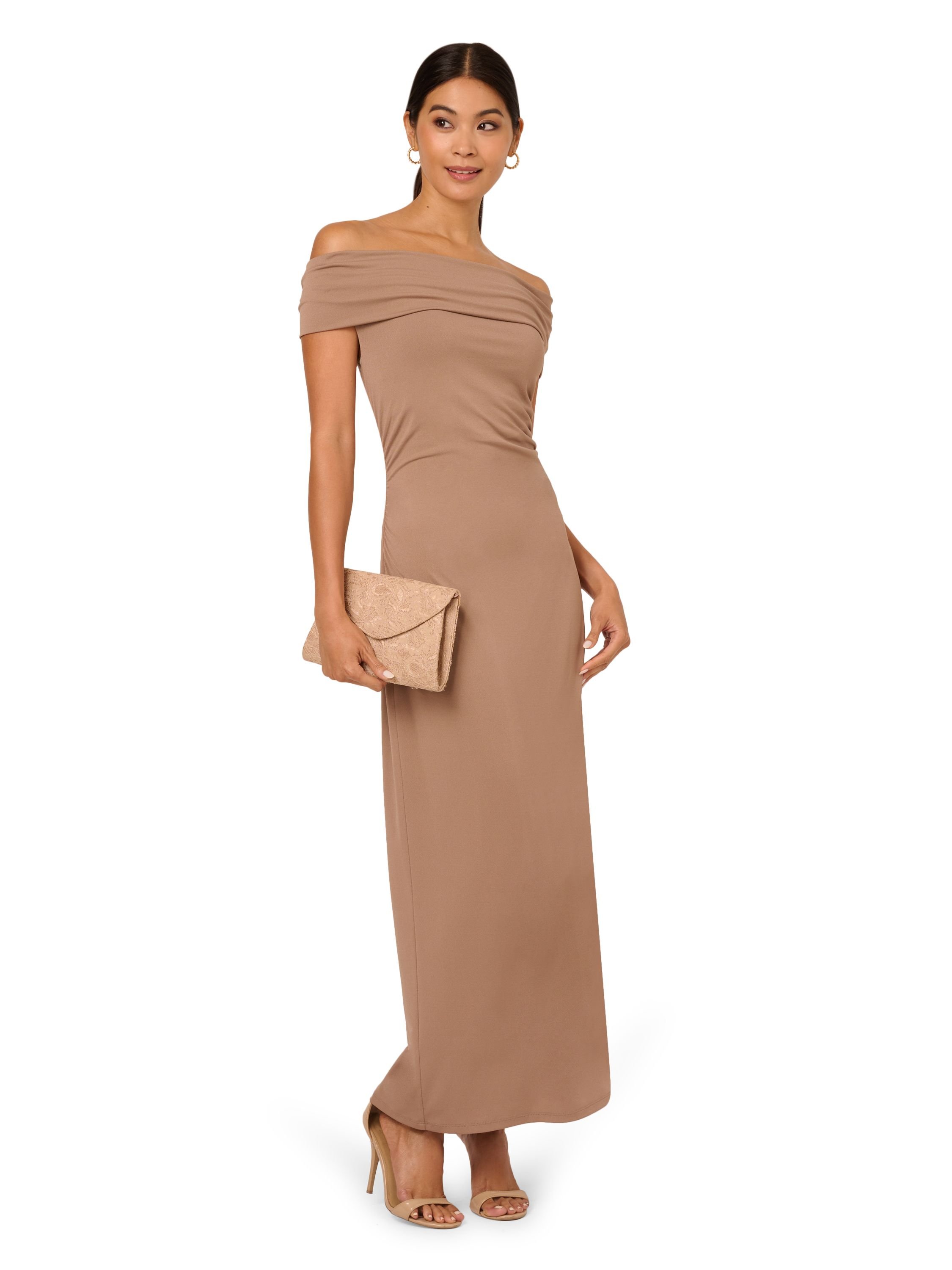 The Adrianna by Adrianna Papell Beige Off Shoulder Long Dress is ideal for evening, date-night, party.