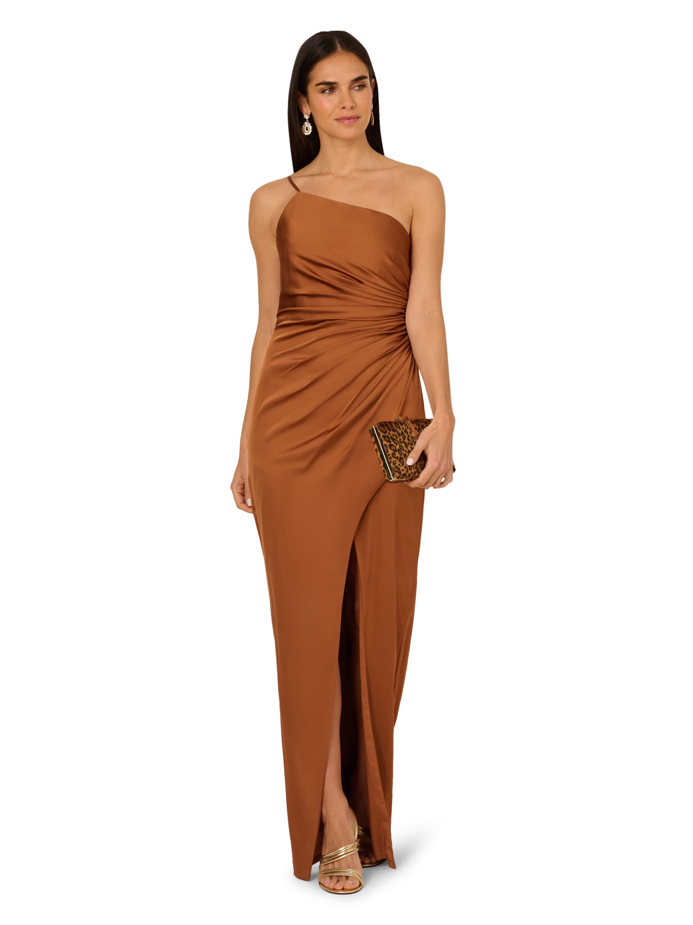 This sleek satin gown creates subtle dimension with elegant, draped details. The spaghetti strap one-shoulder neckline is balanced with a sleek faux wrap skirt, creating a classic column silhouette. Ruched details along the bodice side seam add draped texture and a defined waist.