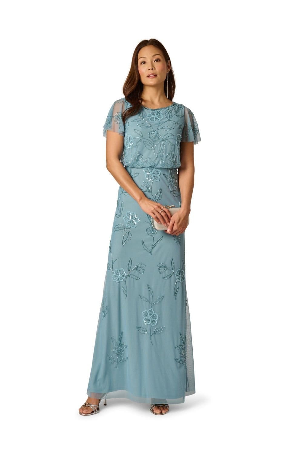 The Adrianna Papell Aqua Bead Blouson Long Dress is available in sizes 10, 12, 8.