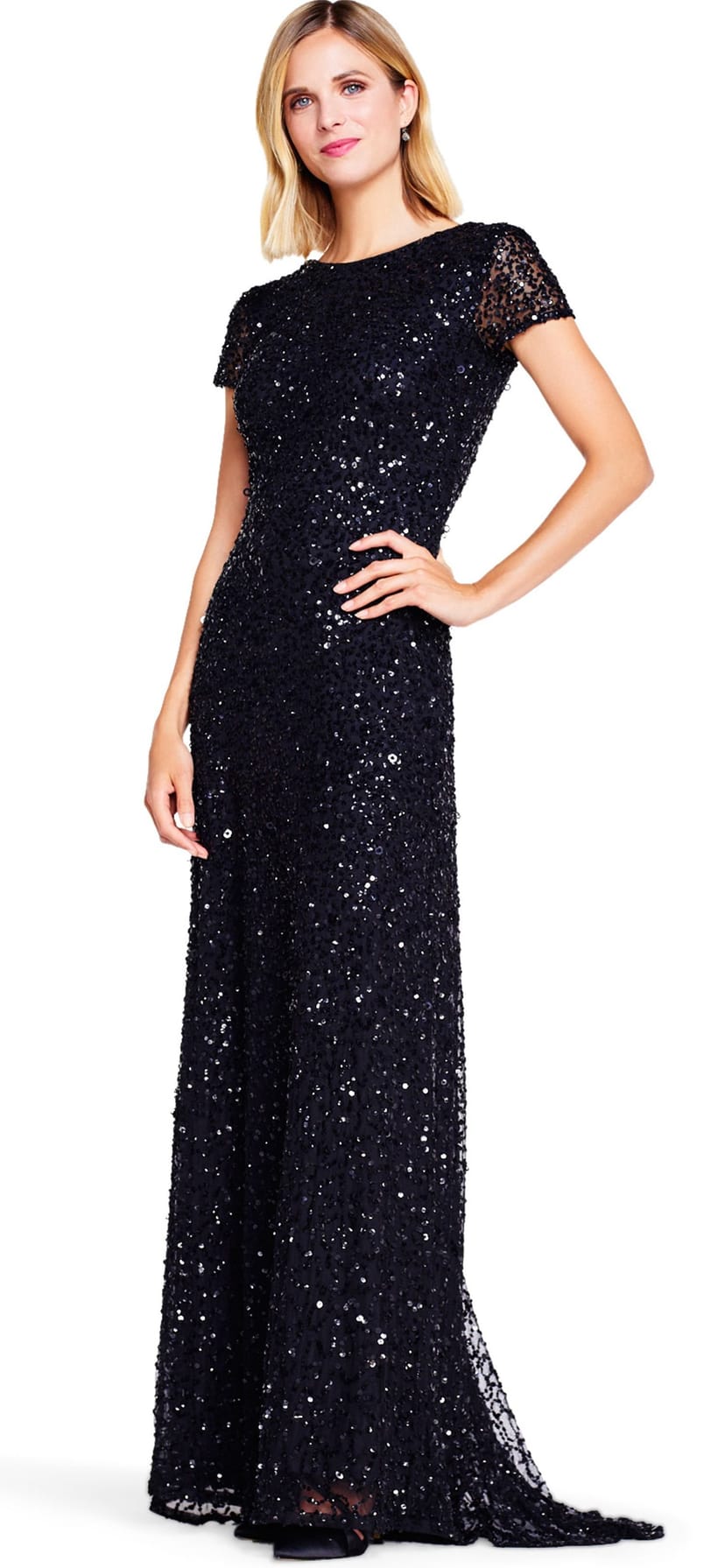 This black sequin evening gown by Adrianna Papell features short sleeves, a crew neck, and a scoop back with a subtle back zipper closure. The long, flowing skirt adds a touch of elegance, perfect for formal events.