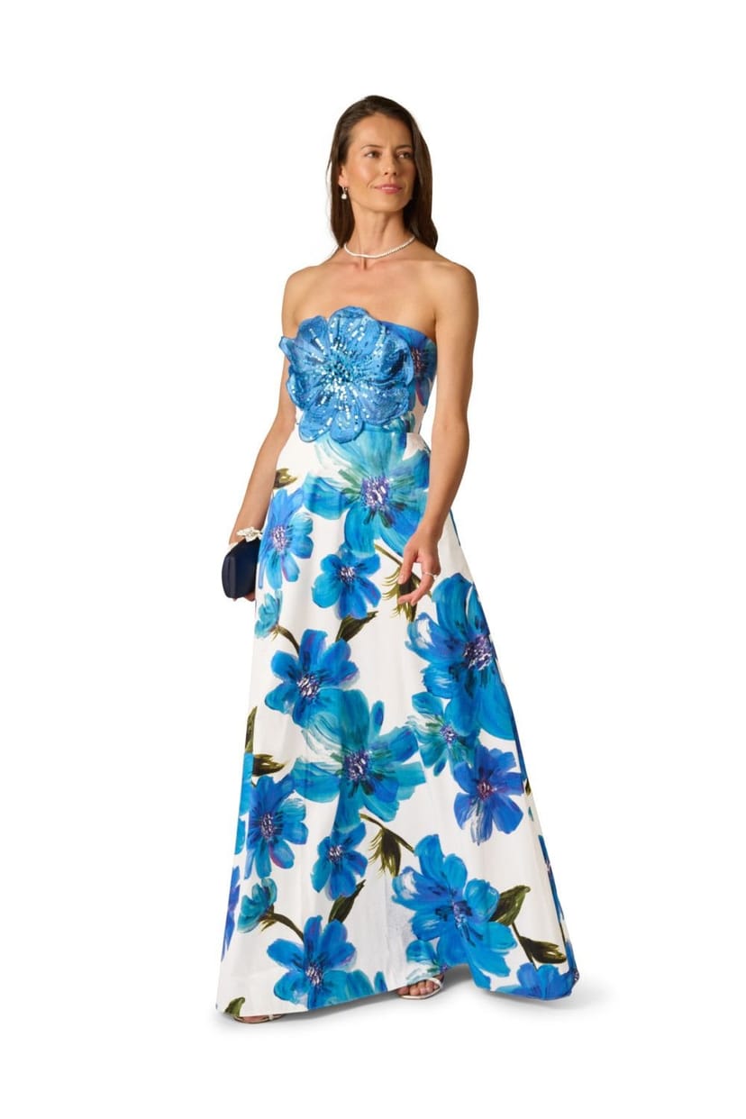 This Adrianna Papell gown features a romantic floral print in blue and white, creating a vibrant and elegant look. The A-line silhouette and strapless neckline highlight the shoulders, while the large beaded flower appliqué adds a touch of glamour. Perfect for special occasions.