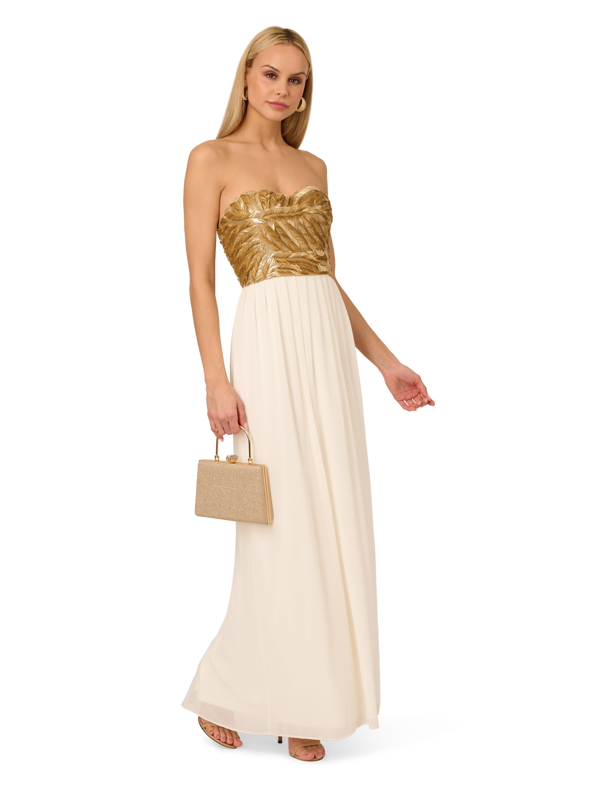 The Adrianna Papell Ivory Beaded Strapless Long Dress is made from georgette.