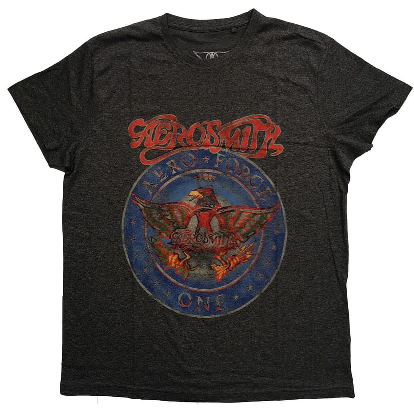 Classic Aerosmith Aero Force T-Shirt in dark brown. Made from 100% ringspun cotton, this tee offers a soft touch and durable fabric technology. Features a printed logo and twin needle stitching for a polished look. Ideal for casual wear.
