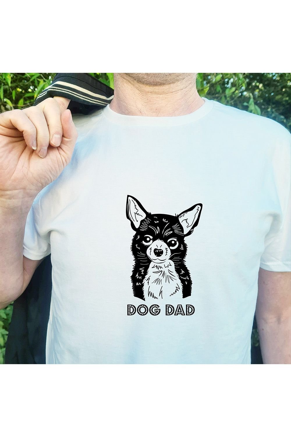 Adorable white t-shirt featuring a monochrome image of a Chihuahua with the text 'DOG DAD'. Made from soft cotton, this tee is perfect for dog lovers and makes a great gift for Dad's birthday or Father's Day.