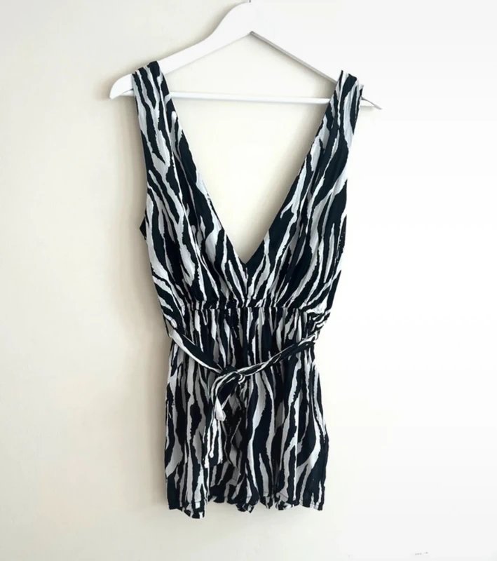 The AKASA Zebra Print Playsuit Plunge V Neck Belted in Black & White is available in sizes S.