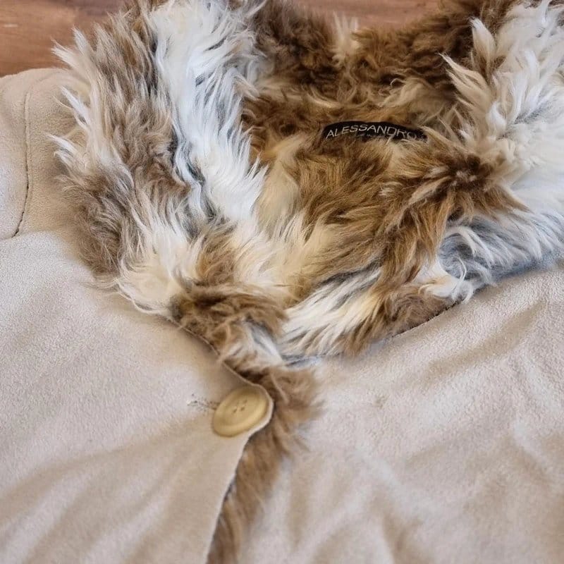 Luxurious Alessandro coat in beige suede with a faux fur-lined collar. Designed for warmth and style, this coat is perfect for chilly days.