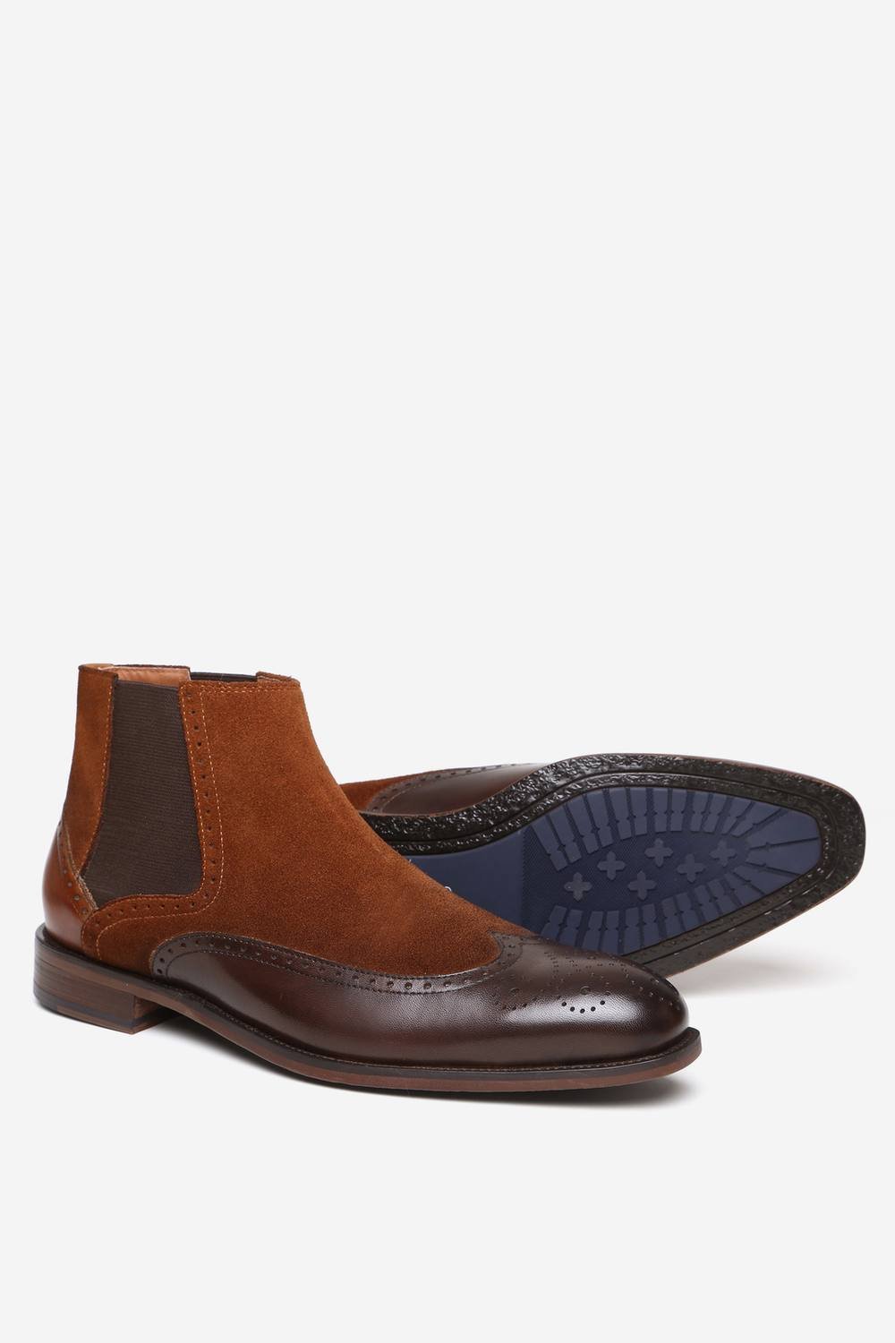 Exceptionally handcrafted Raleigh Suede Leather Chelsea Wingtip boot with an elasticated side panel for easy slip-on. Featuring a dark blue treaded grip outsole for stability and style. Perfect for any occasion.
