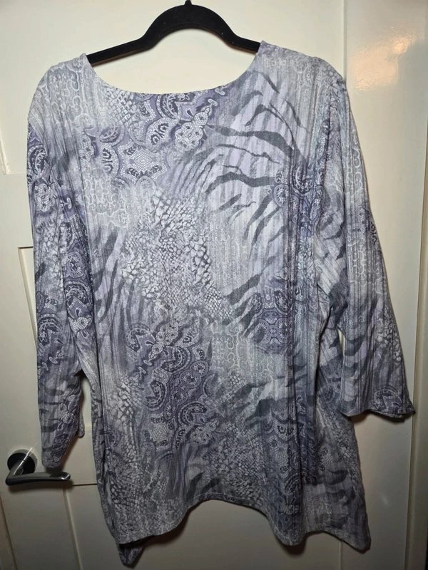 Alfred Dunner Lilac Embellished Hanky Hem Tunic Top — a versatile boho-inspired piece for any occasion. Designed in a soft purple-grey mixed print, this long-sleeve tunic features an embellished neckline and a flattering hanky hem. Crafted from lightweight sheer chiffon with subtle embellishments, it offers a relaxed floaty fit for ultimate comfort. Perfect for pairing with leggings, slim trousers, or jeans.