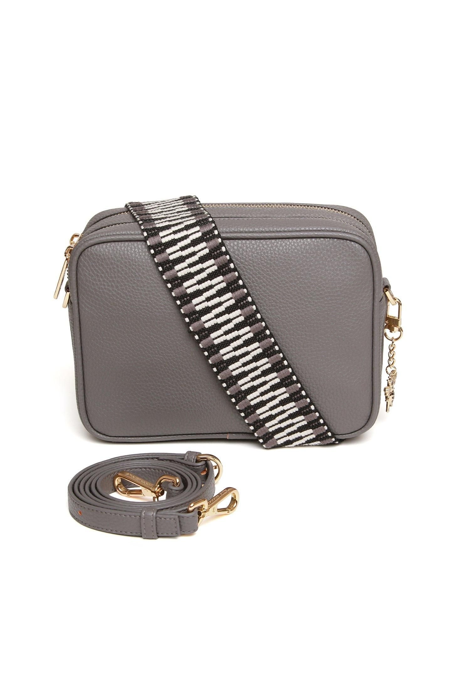 Stylish grey leather crossbody bag by Alice Wheeler London. Features a hands-free design with twin compartments, fully lined and secured with a metal zip fastening. Perfect for keeping your essentials organised and secure.