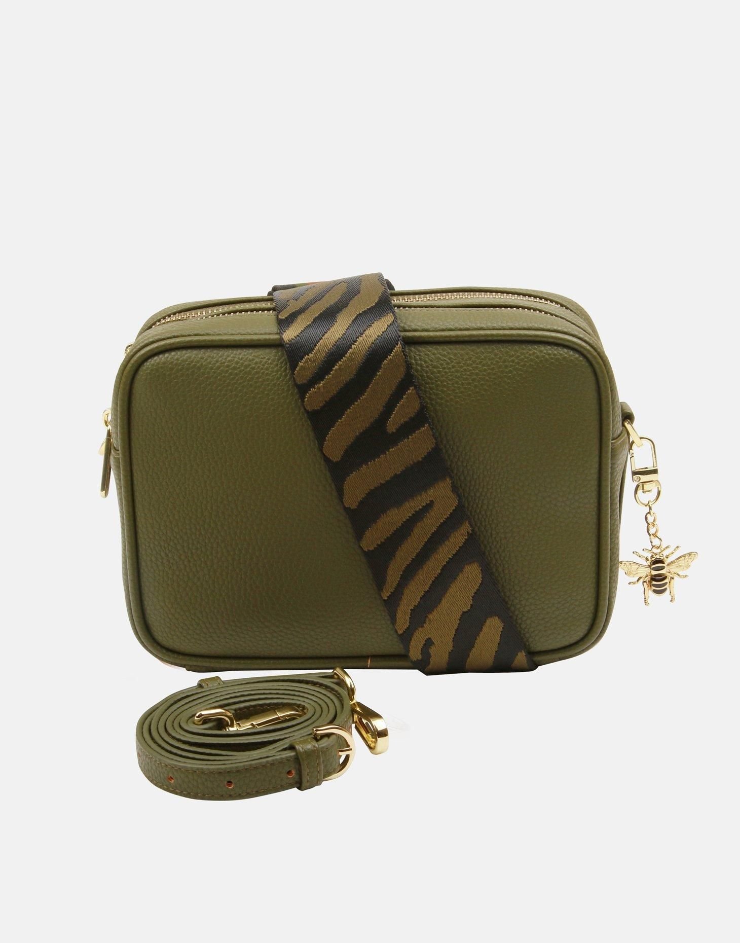 Stylish Olive Soho crossbody bag by Alice Wheeler London. Features a zebra-print strap and a bee charm. Made from leather with a gold-tone hardware, it offers hands-free convenience with its adjustable strap.