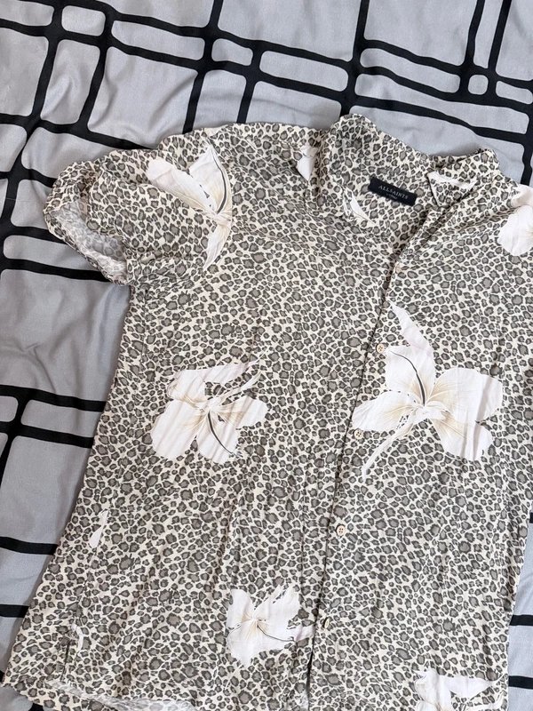 An awesome XL slim fit shirt from AllSaints, featuring a leopard print floral sewing pattern. Perfect for a stylish and edgy look.