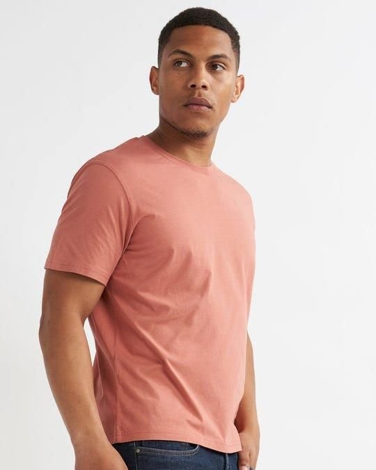 Stylish coral crewneck t-shirt made from 100% premium BCI cotton. Features a luxurious texture and a classic silhouette. Ideal for all seasons, this tee offers a comfy fit and is a versatile wardrobe essential.