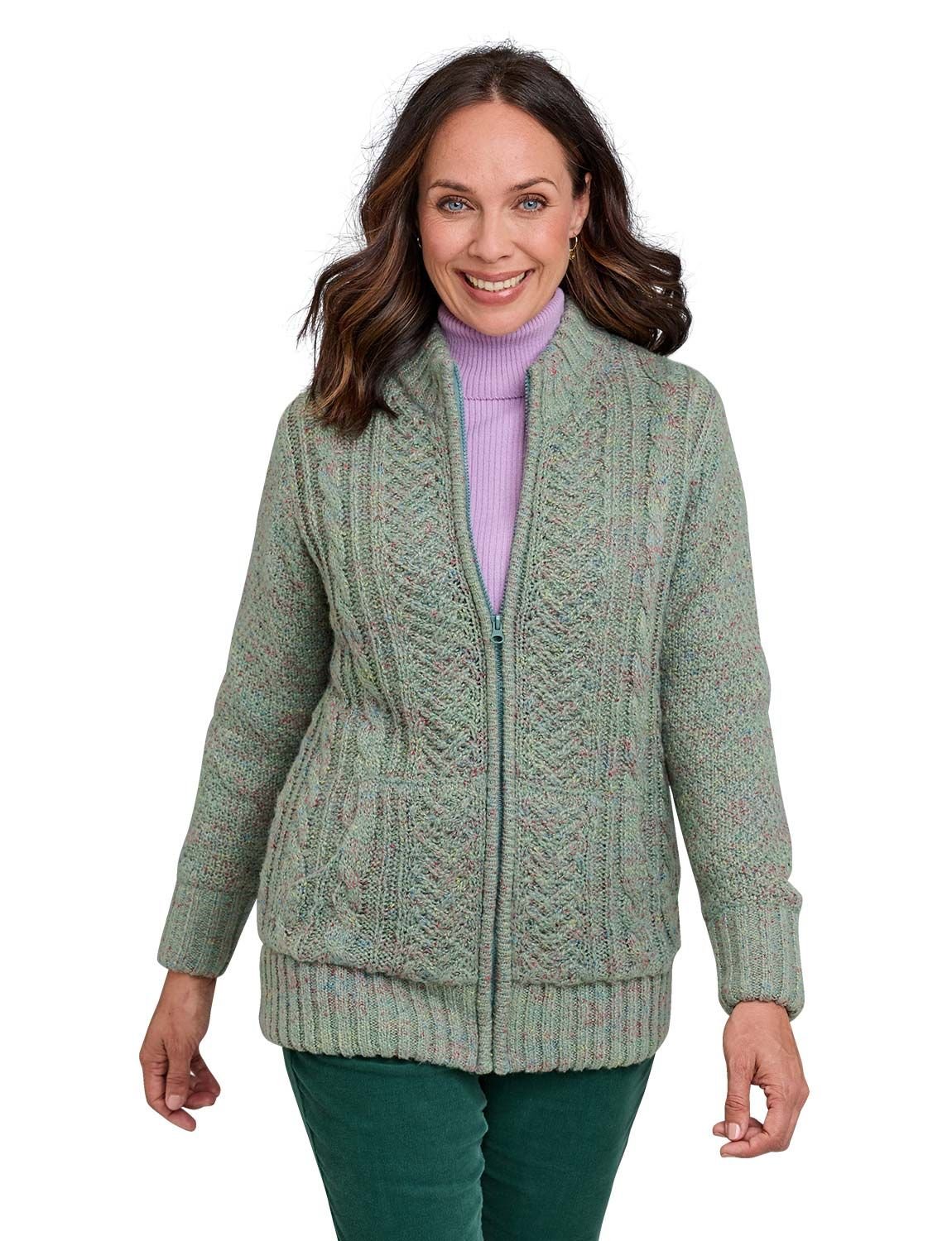 This Amber cardigan features a Borg fleece lining for warmth and a cable knit design in a marl fleck yarn. The zipper closure adds convenience, making it perfect for layering.