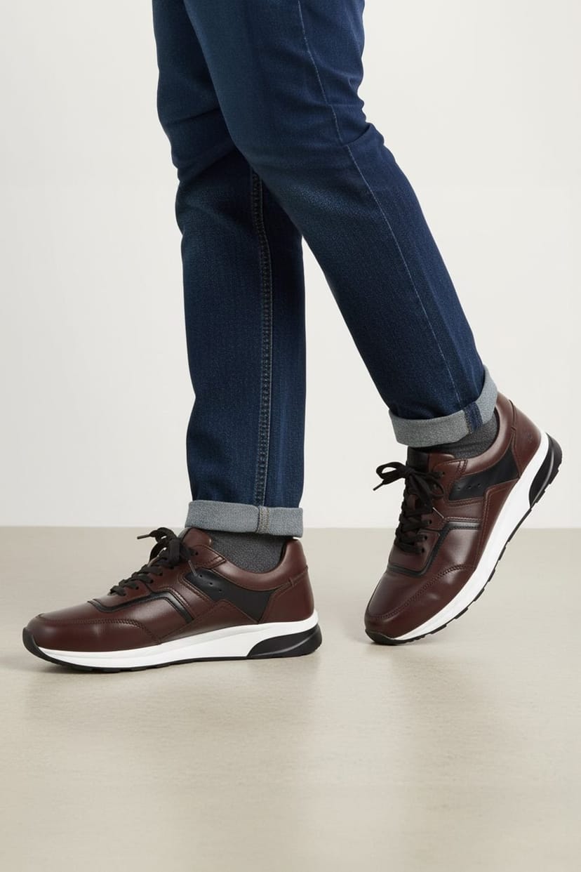 Sporty, smart-casual men's dress trainer crafted from rich leather. Perfect for everyday wear, it features detailed paneling, cushioned lining, and a soft insole. The lightweight EVA sole offers excellent grip and flexibility.