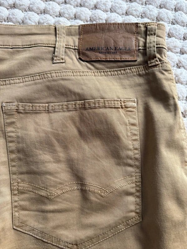 High-quality tan skinny jeans by American Eagle. Made from durable fabric, these jeans offer a super comfortable and stylish fit. Ideal for pairing with a black top for a versatile look.