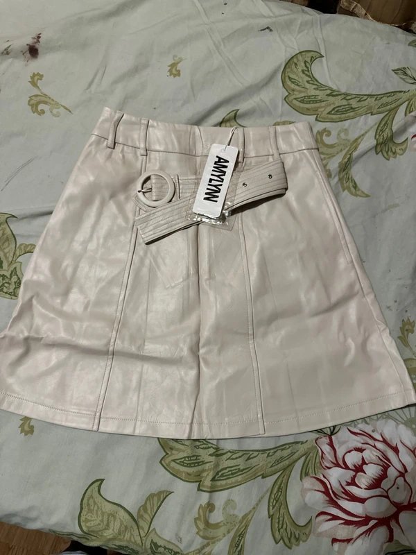 This Amy Lynn belted a-line leather look mini skirt in cream is a versatile addition to any wardrobe. Designed with a belted waist and a-line silhouette, it offers a flattering fit. Crafted from a leather-like material, it exudes a chic and sophisticated vibe. Perfect for casual outings or adding a touch of edginess to your evening look.