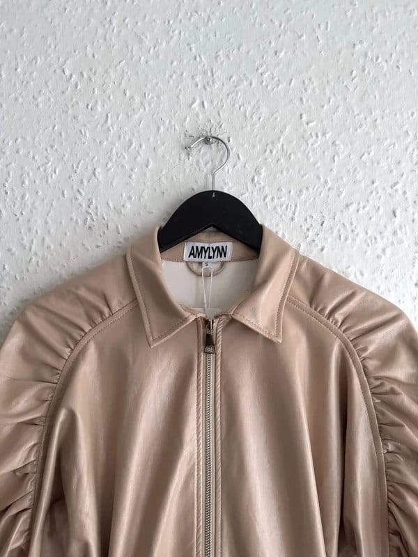 This beige patent faux-leather jacket by Amy Lynn features puffed sleeves and a sleek silhouette. Perfect for adding a touch of luxury to any outfit.