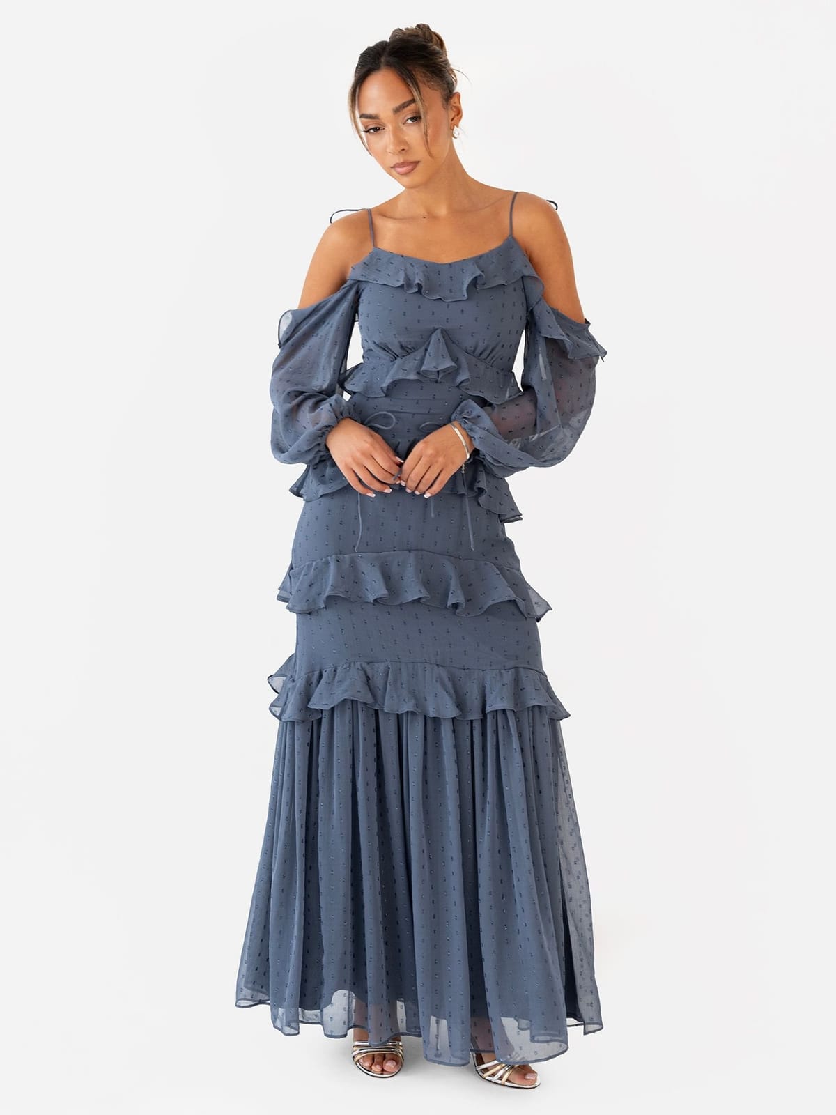 This blue chiffon maxi dress features a cold shoulder neckline with self-tie straps, soft ruffles, and long sleeves. The shimmery metallic threads add a touch of elegance, while the layered ruffles cascade down an A-line skirt. Perfect for evening events or date nights.