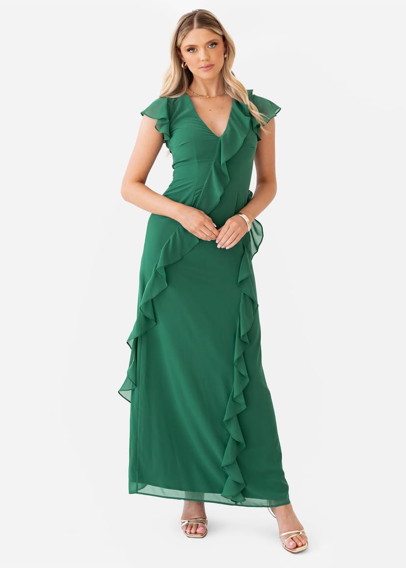 Elegant maxi dress in dark green with a V-neckline and flutter sleeves. The cascading ruffles add a touch of sophistication. Ideal for evening events.