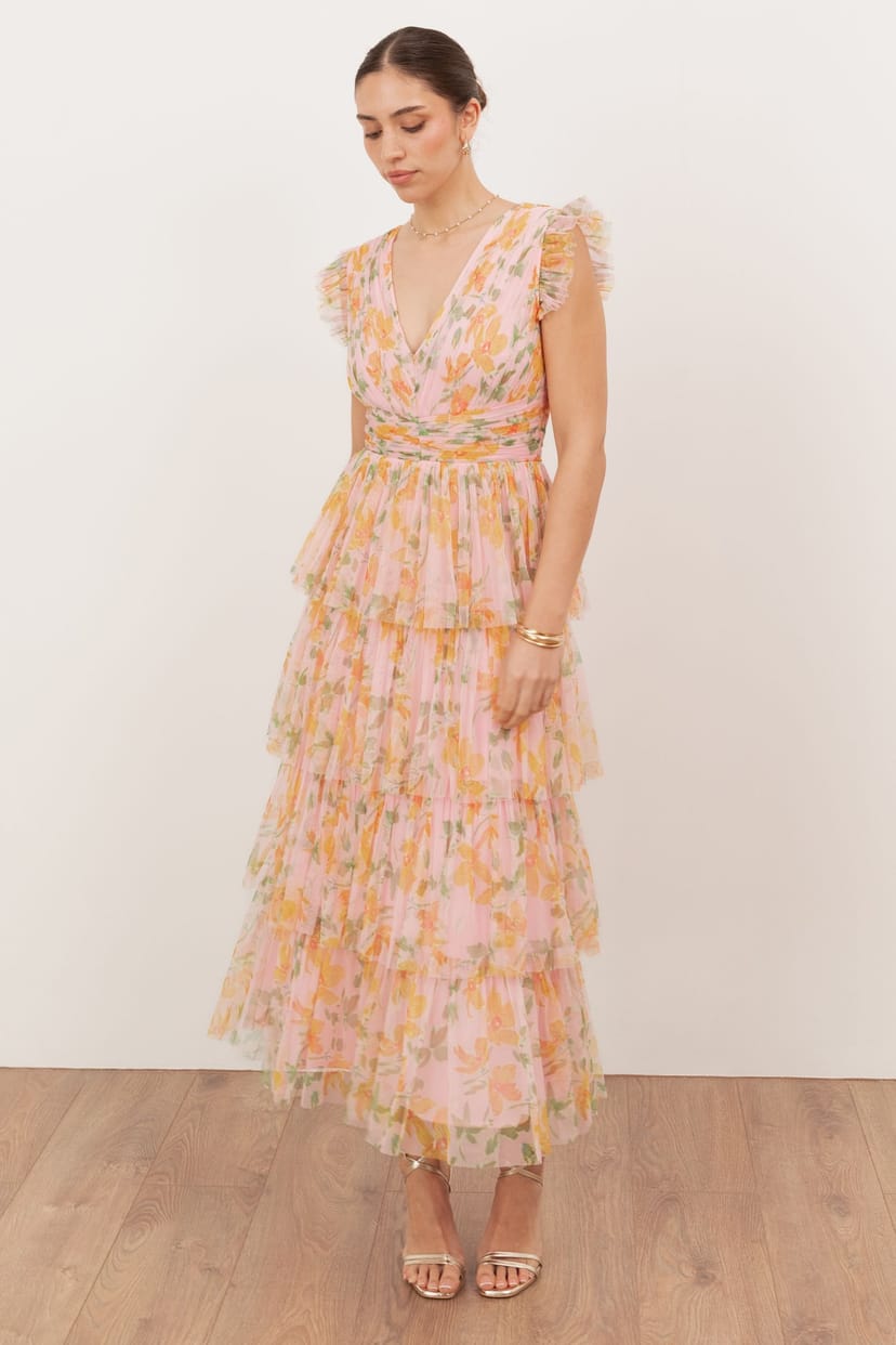 This pink floral midi dress features a meticulously gathered design, a delicate floral print, and a flattering A-line silhouette. A horizontally gathered waist panel defines the shape, while flutter sleeves and a V-neckline add feminine charm. The tiered ruffle skirt brings subtle volume.