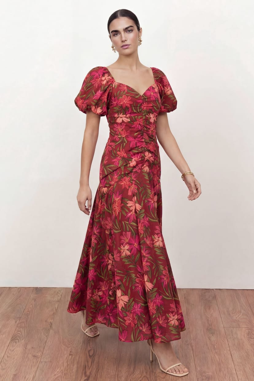 This red floral ruched midi dress features a sweetheart neckline and short puffed sleeves. The asymmetrical dropped-waist bodice with a ruched centre adds a touch of elegance. Perfect for special occasions.