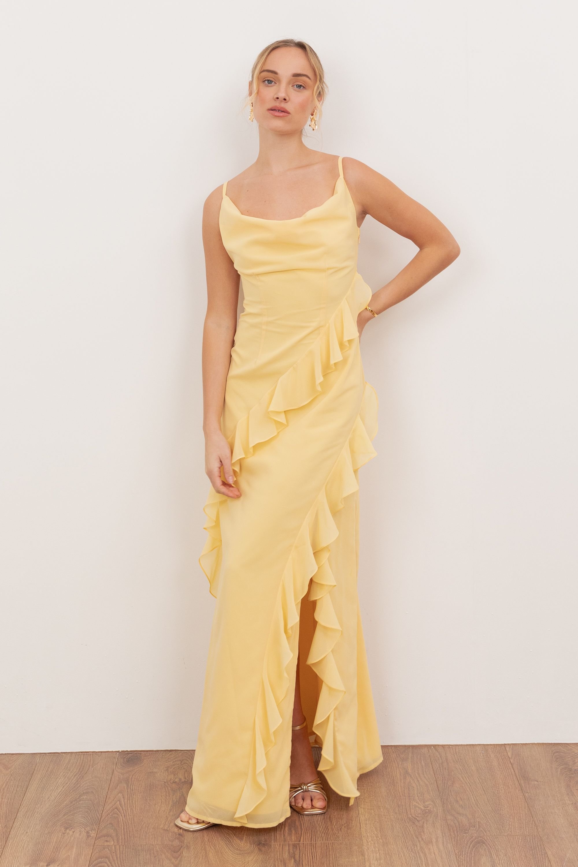 This yellow maxi dress features a cowl neckline and adjustable straps. It boasts diagonal ruffles cascading from the bodice to the hem, creating a flowing silhouette. Perfect for evening events or special occasions.