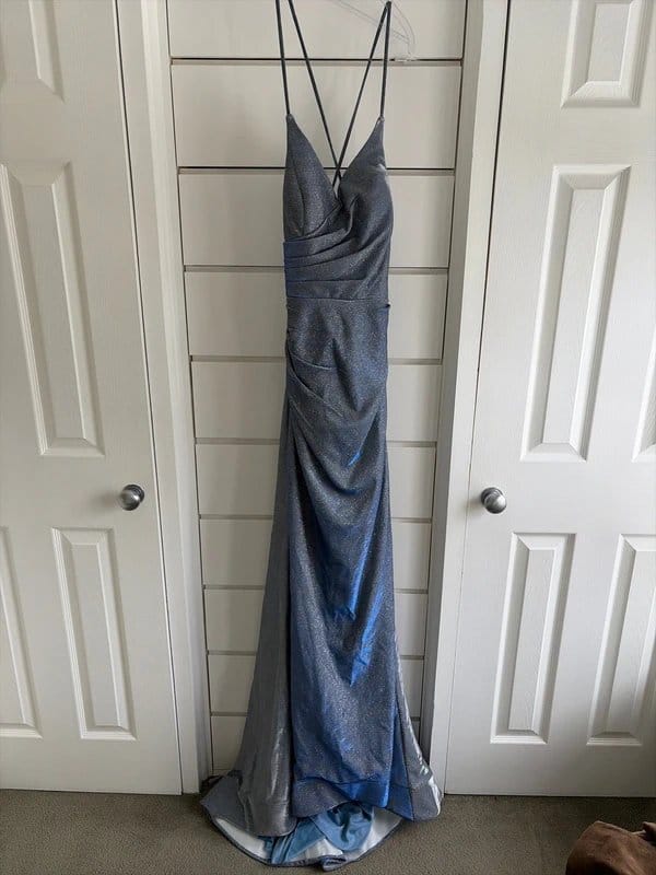 Elegant sparkle prom dress by Angel Forever. Features a tie-up low back and a ruched front, flares out towards the bottom, and is fully lined. The blue shimmery color adds to its allure.
