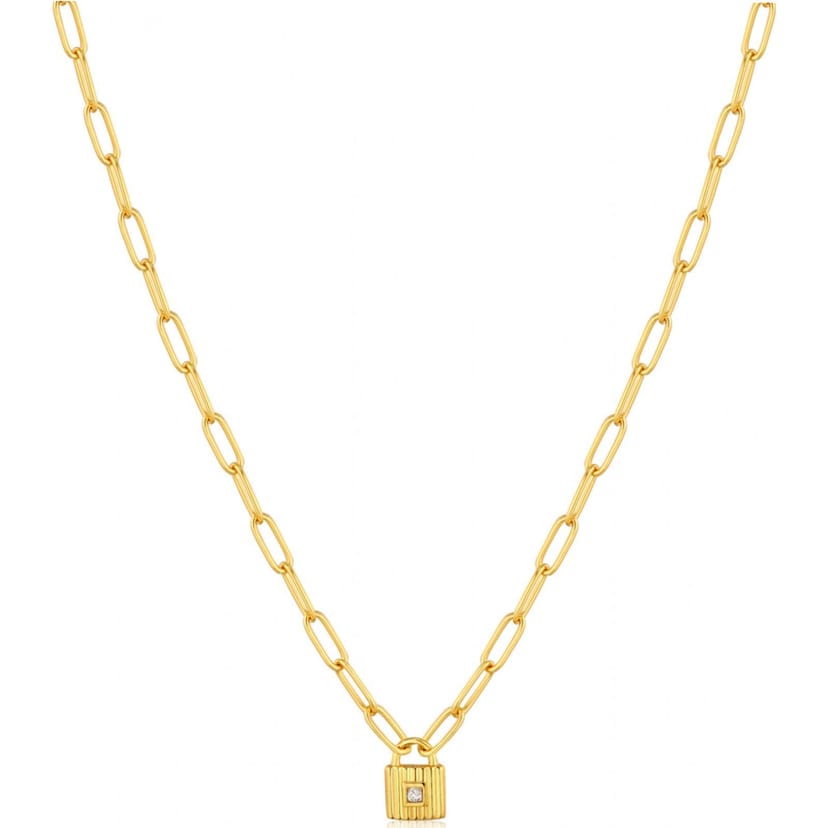 This gold chain necklace from Ania Haie features a padlock pendant with a diamond accent. Crafted with a link chain, it adds a touch of elegance to any outfit.