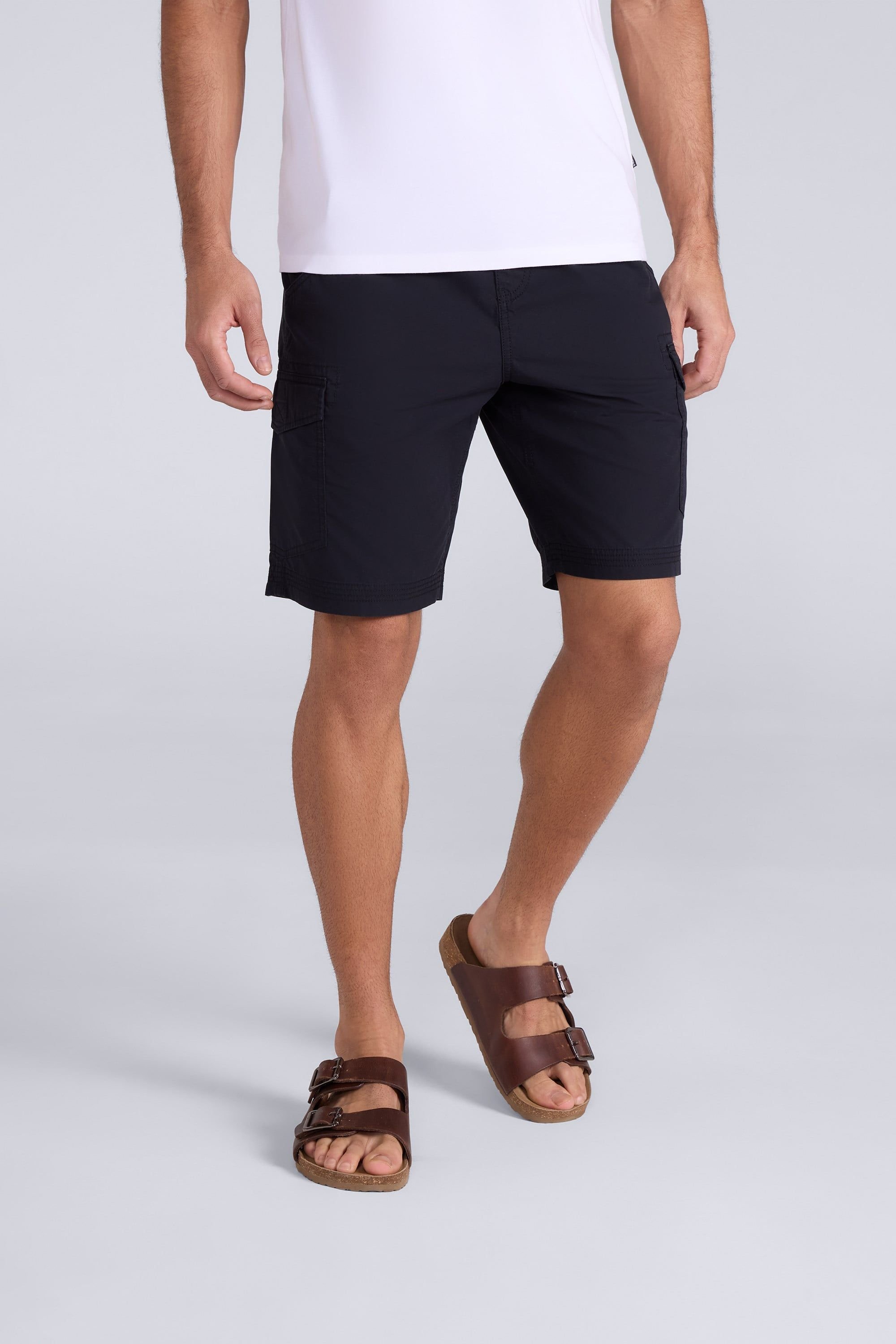 Stylish cargo shorts in black cotton with multiple pockets and a casual fit. Perfect for relaxed summer outings.