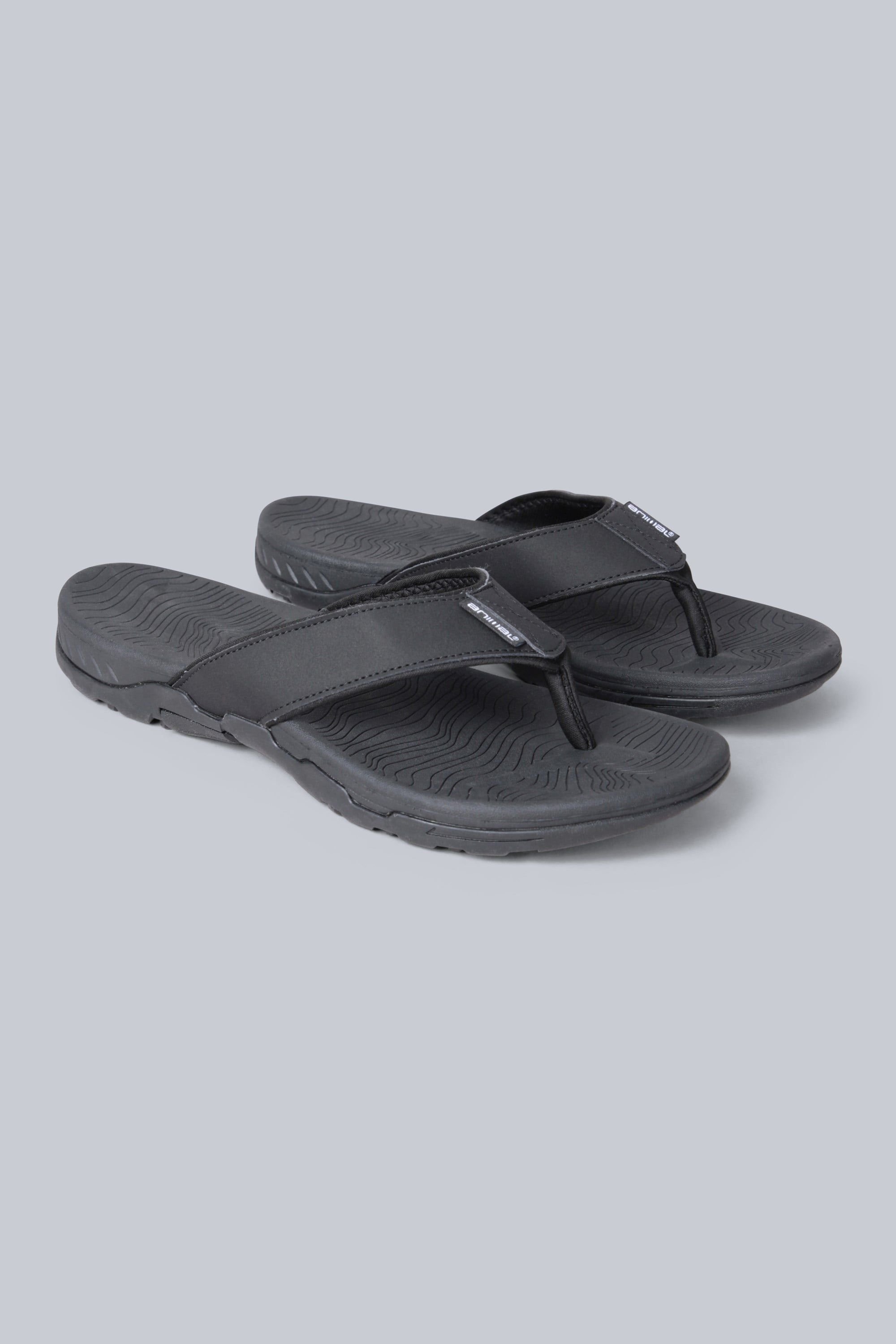 Casual flip flops in black featuring a lightweight and comfortable design. Perfect for outdoor activities and everyday wear.