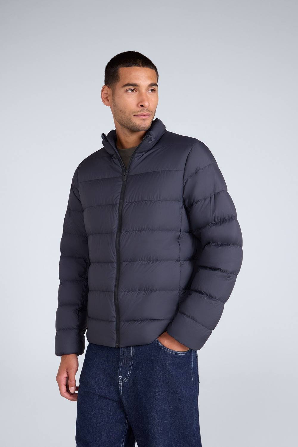 Stylish men's lightweight puffer jacket in black. Made from water-resistant fabric, it features a hooded design and padded quilting for warmth. Ideal for cool weather.