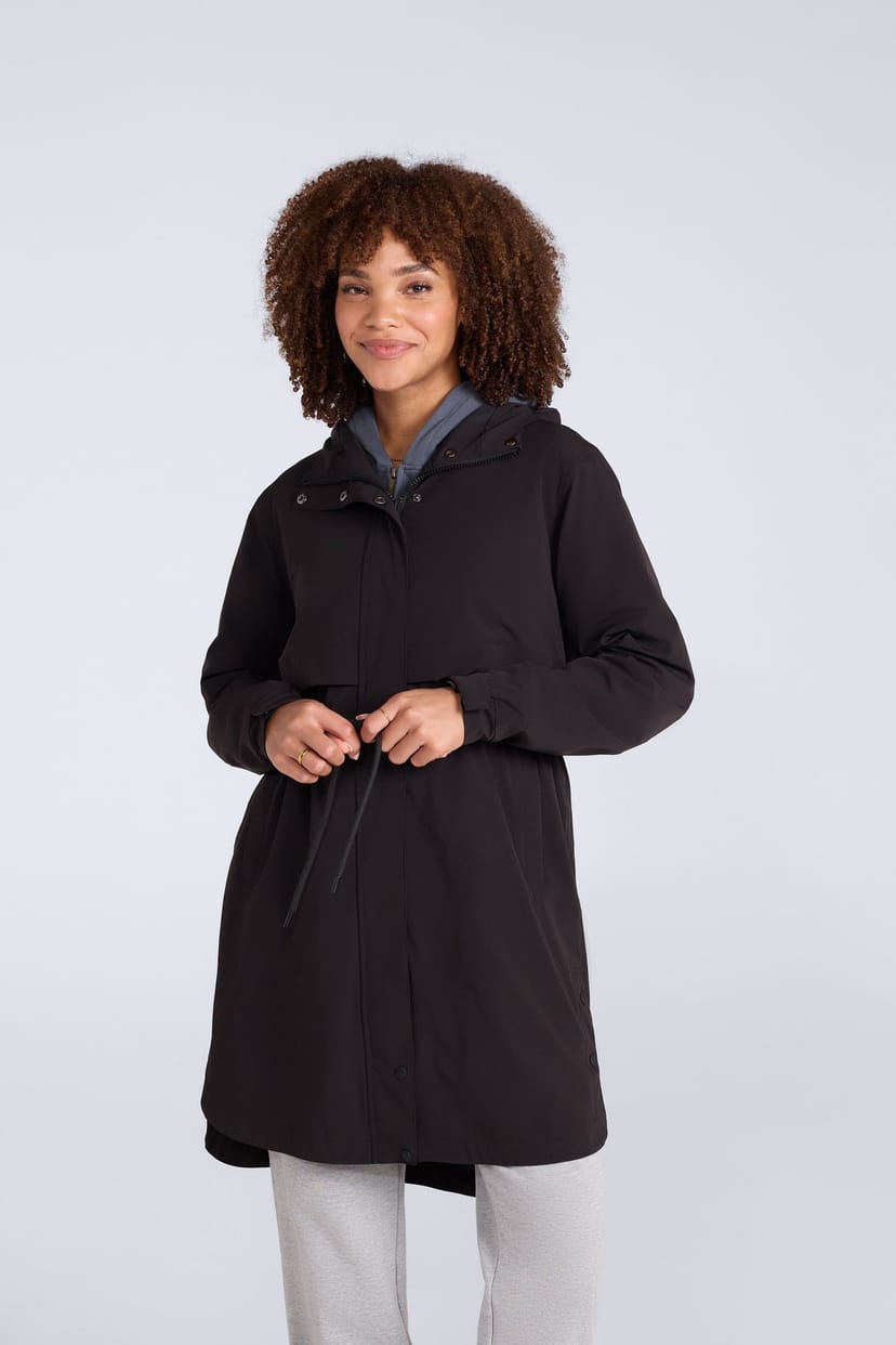 Stylish water-resistant lightweight jacket in black. Features a detachable hood, two pockets, and an adjustable waist for a tailored fit. Perfect for casual outings or layering over other garments.