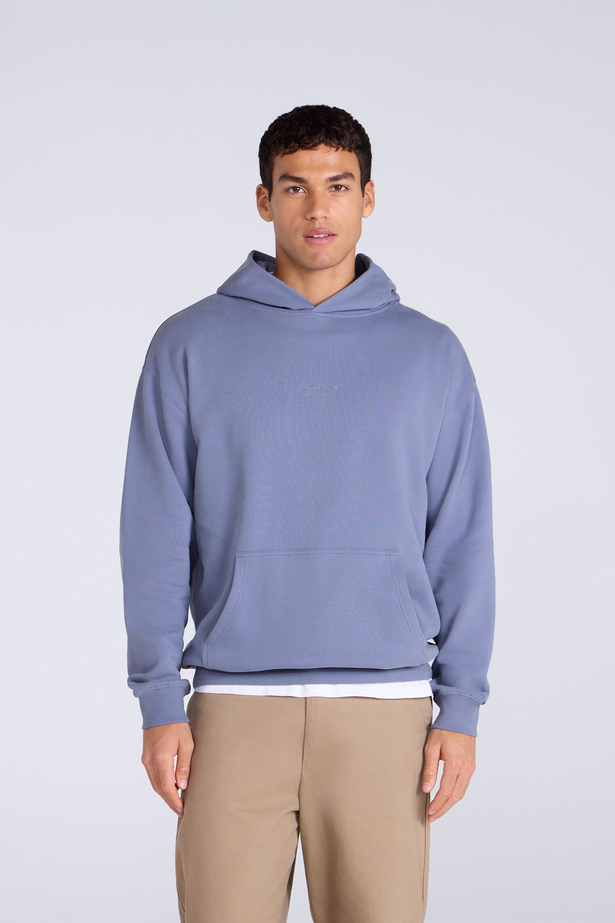 Stylish Animal men's hoody in blue cotton with a logo print on the front. Features a drop shoulder design and a kangaroo pocket. Perfect for casual wear.