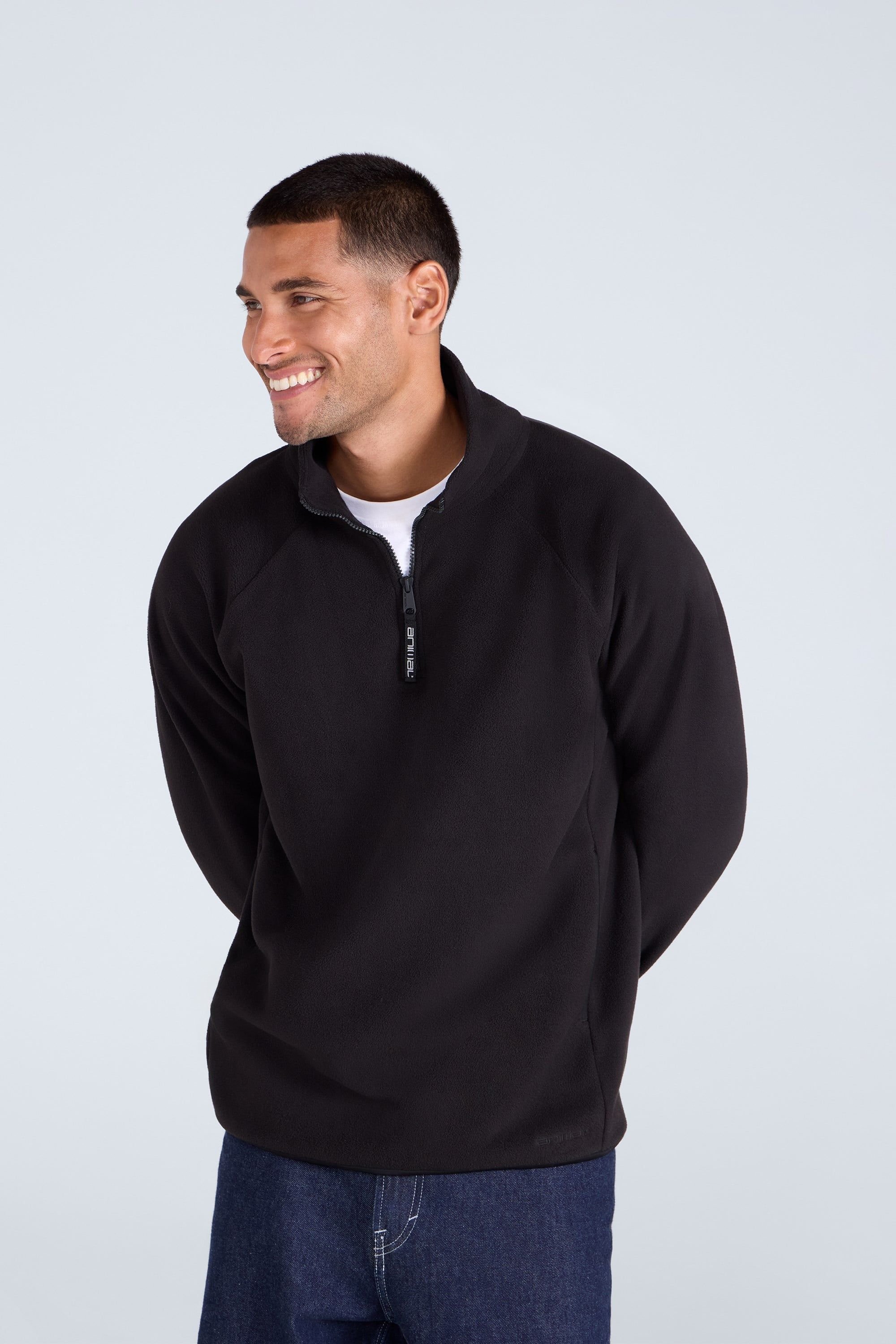 This jet black fleece half-zip sweater from Animal is designed for ultimate warmth and comfort. Featuring a snug fit and breathable fabric, it's perfect for layering during cooler weather.