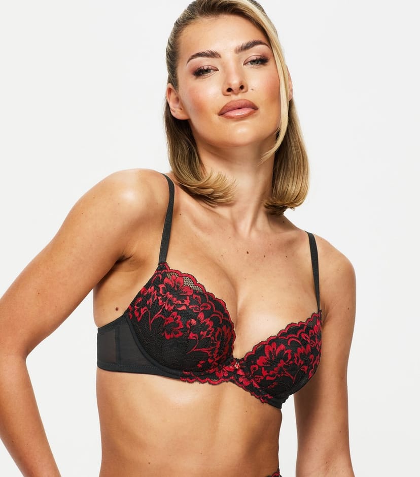 Sensational black lace plunging bra by Ann Summers with red floral lace and diamante detailing. Padded for a flattering fit, featuring adjustable straps and back hook and eye fastening. Perfect for a touch of luxury.