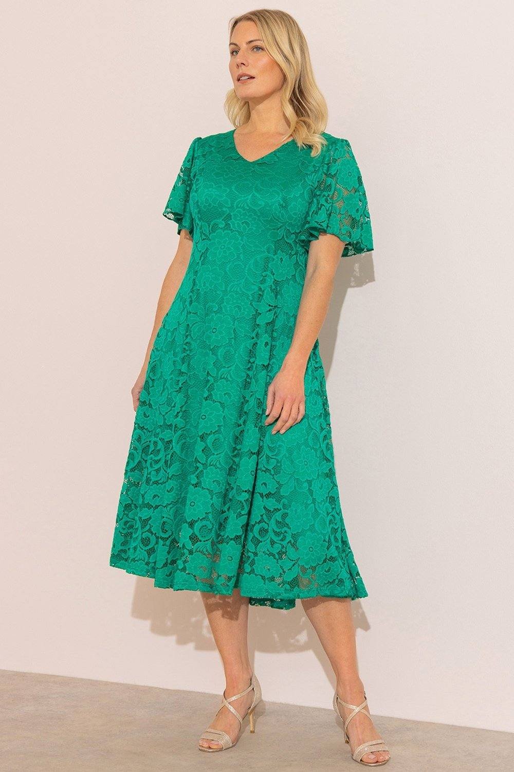 Elegant floral lace dress in Jade perfect for your next party. Features a V-neckline, short lace sleeves, and a fit and flare finish. Fully lined for comfort.