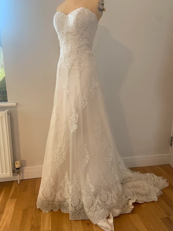 The Anna Sorrano Embroidered Lace Wedding Dress in Ivory is available in sizes S.
