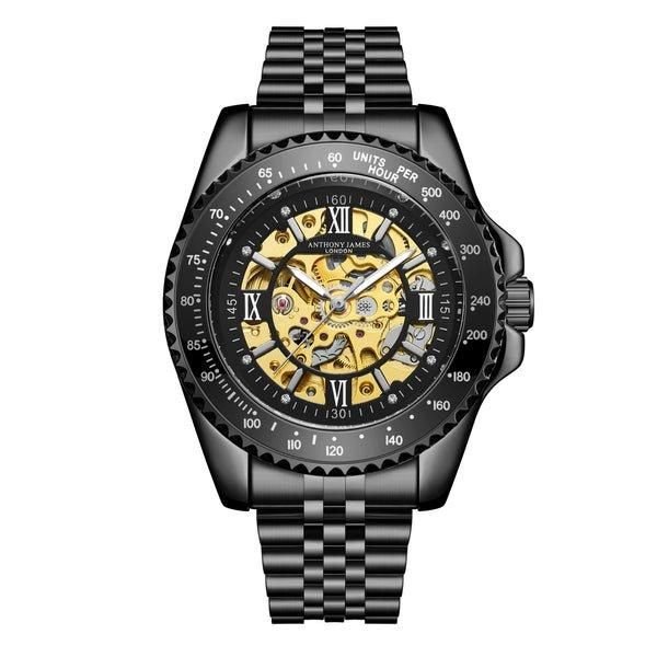 Stylish black Tachymeter sports watch by Anthony James. Features a black open dial and a stainless steel skeleton case back showcasing the intricate movement. Ideal for casual and formal occasions.