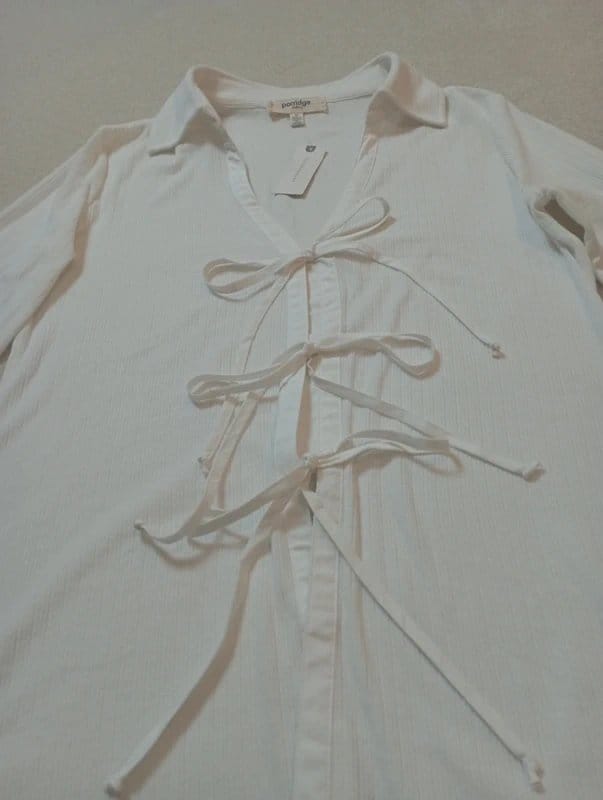Versatile Anthropologie shirt in ivory with a front tie fastening and ribbed texture. Perfect for layering in autumn or pairing with shorts in summer.