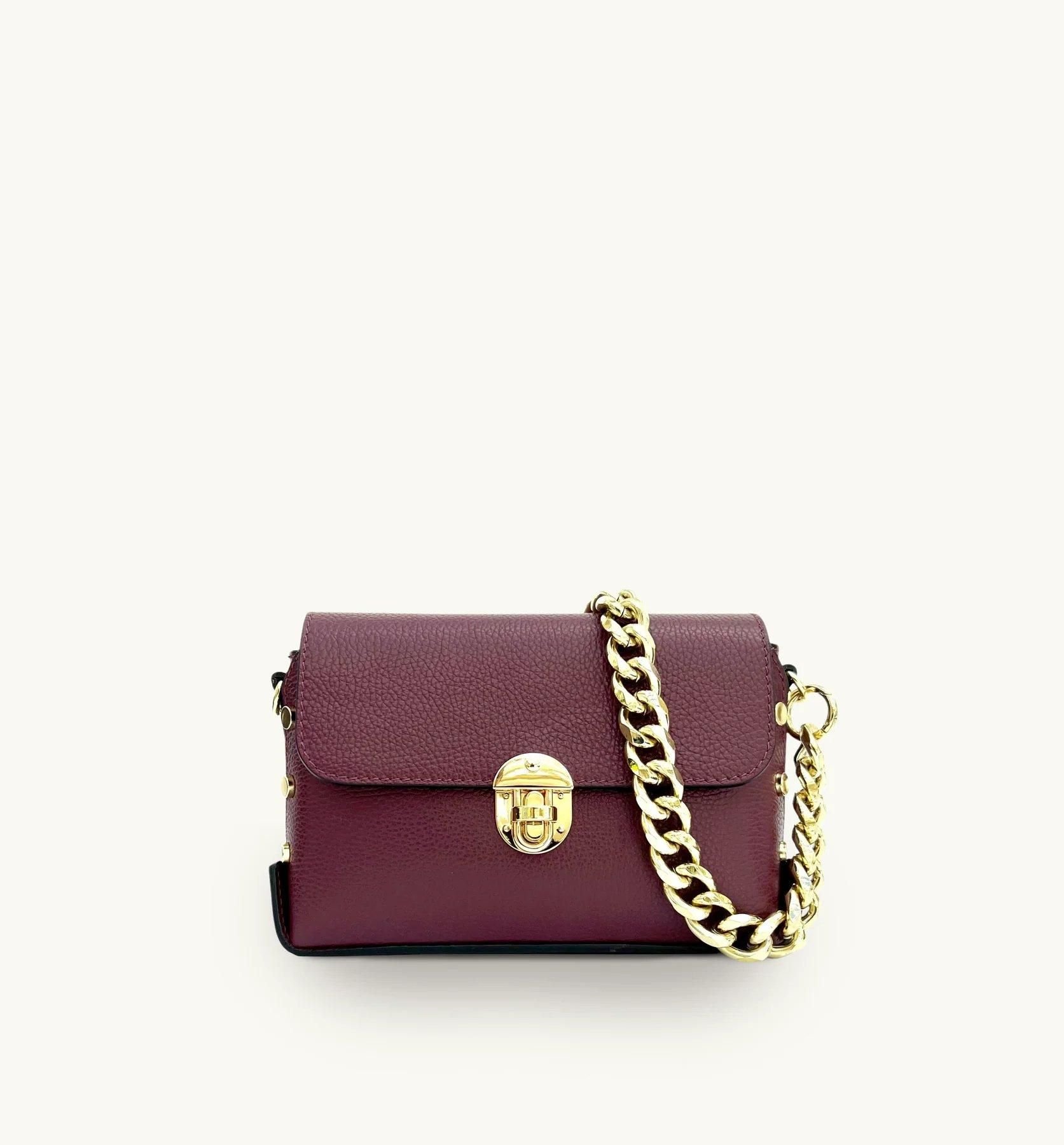 The Apatchy London Plum Leather Crossbody Bag With Gold Chain is made from leather.