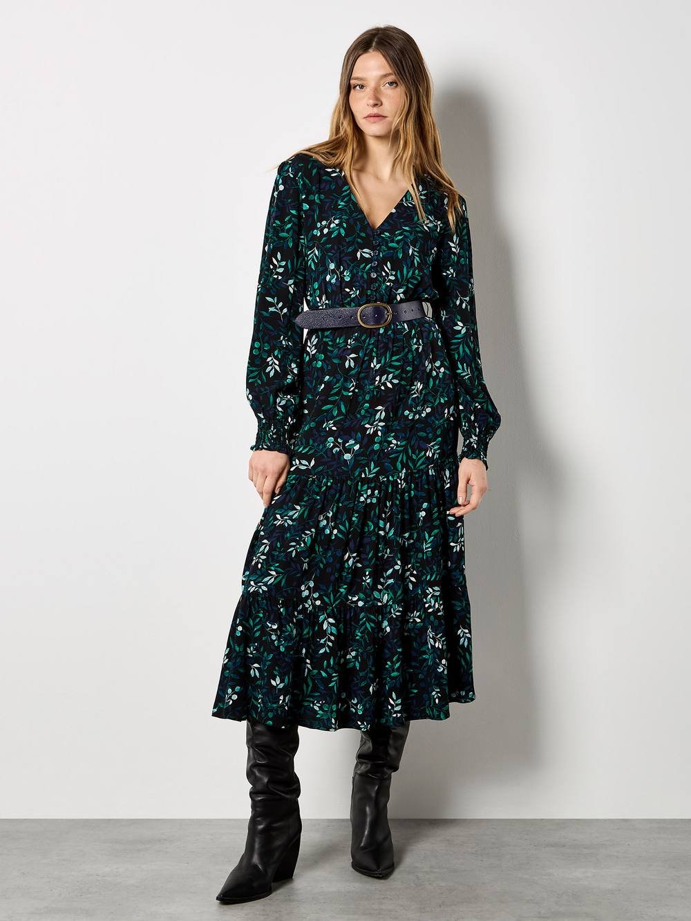 Versatile maxi dress in black with a striking eucalyptus leaf print. Crafted from crepe fabric, it features balloon sleeves, a button-down bodice, and an elastic waist with a fabric belt for a perfect fit. The tiered skirt adds a stylish touch.