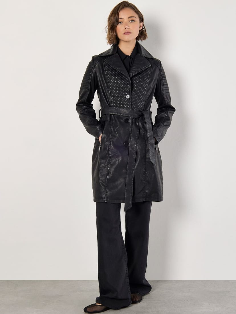 The Apricot Black Faux Leather Biker Trench Coat is ideal for casual, evening, date-night.