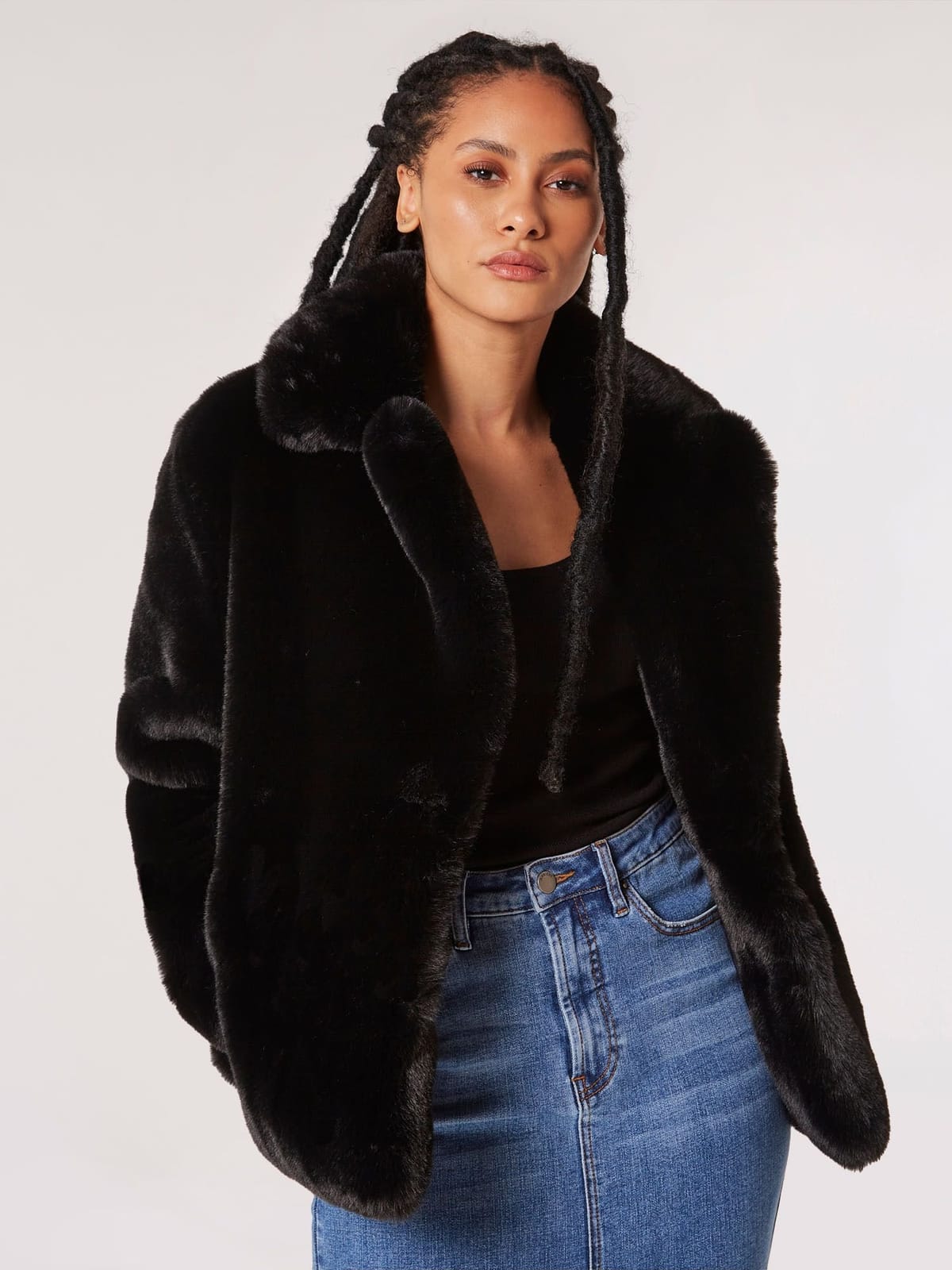 Luxurious black faux fur short coat by Apricot. Fully lined for warmth, it features a collar, lapels, and a full button-down front. Ideal for chilly days.