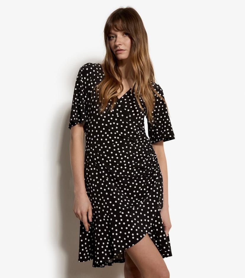 Playful black dot print wrap dress from Apricot. Features a ruched side and pleated tiered hem. Ideal for casual or semi-formal occasions.