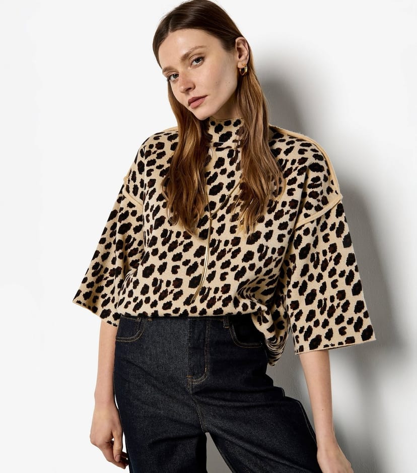This brown animal-print jumper by Apricot features a high neck and half sleeves. The boxy fit and exposed seams add a modern touch to your wardrobe. Ideal for casual outings.