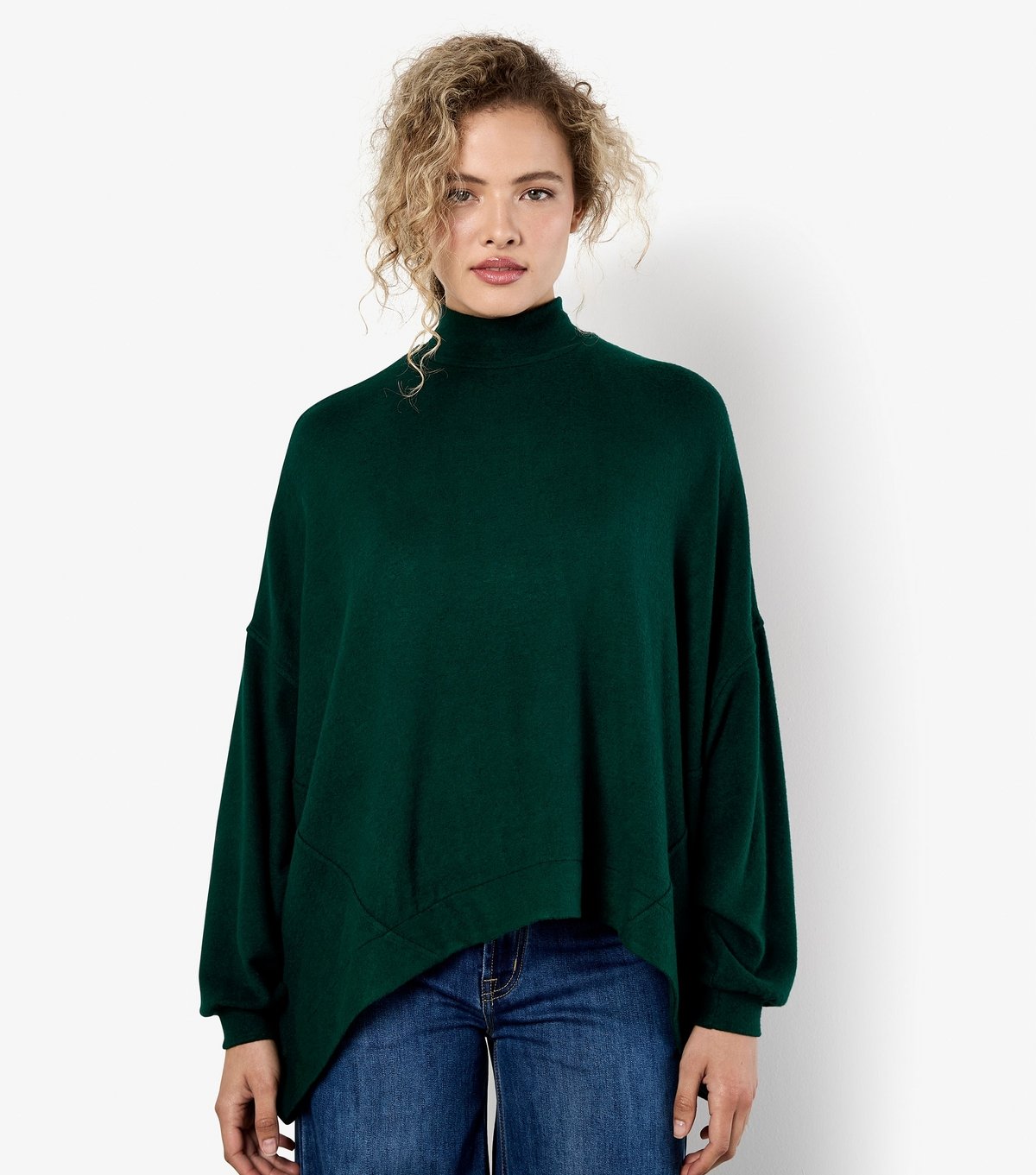 This dark green jumper by Apricot features a relaxed fit and a high neck. Made from soft touch fabric, it has a pull-over fastening and an asymmetric hem. Ideal for casual wear.