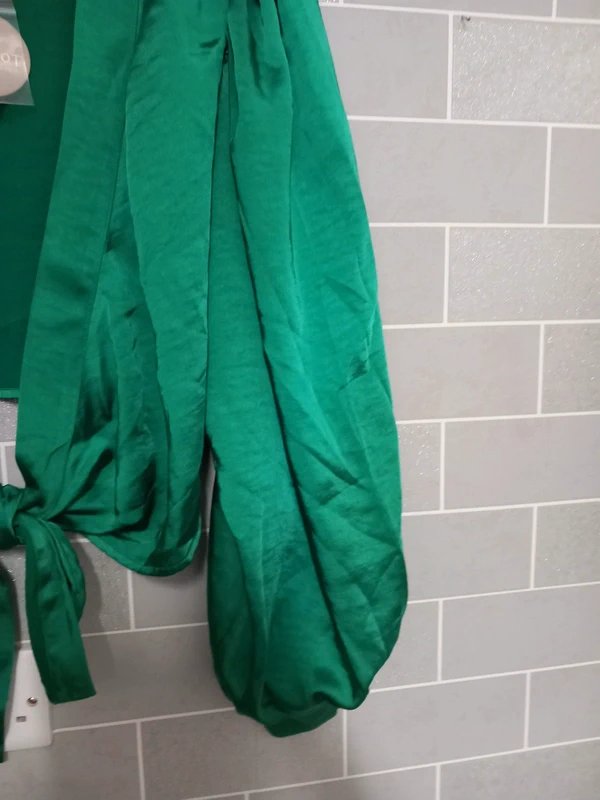 Emerald green satin top by Apricot. Designed in vibrant emerald green, this long-sleeve top features a sheer, flowy silhouette for a flattering fit. Crafted from luxurious satin, it catches the light beautifully. Perfect for adding a touch of elegance to any outfit.